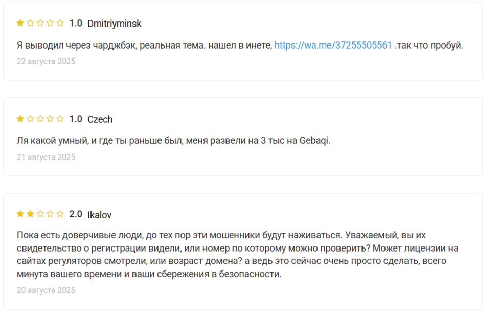 Как свидетельствуют отзывы, Geba qi co – мошеннический брокер, который не дает зарабатывать. Он забирает деньги пользователей, ничего им не возвращает. Клиенты указывают на отсутствие лицензии, что подтверждает незаконную деятельность платформы.