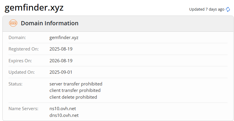 Домен сайта gemfinder xyz был зарегистрирован 19 августа 2025 года. Апдейт произошел 1 сентября 2025 года. Вероятнее всего, именно тогда на него и загрузили сайт.