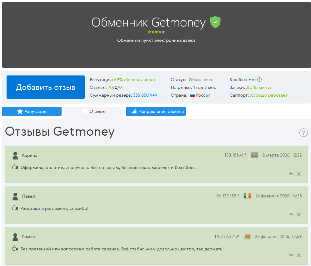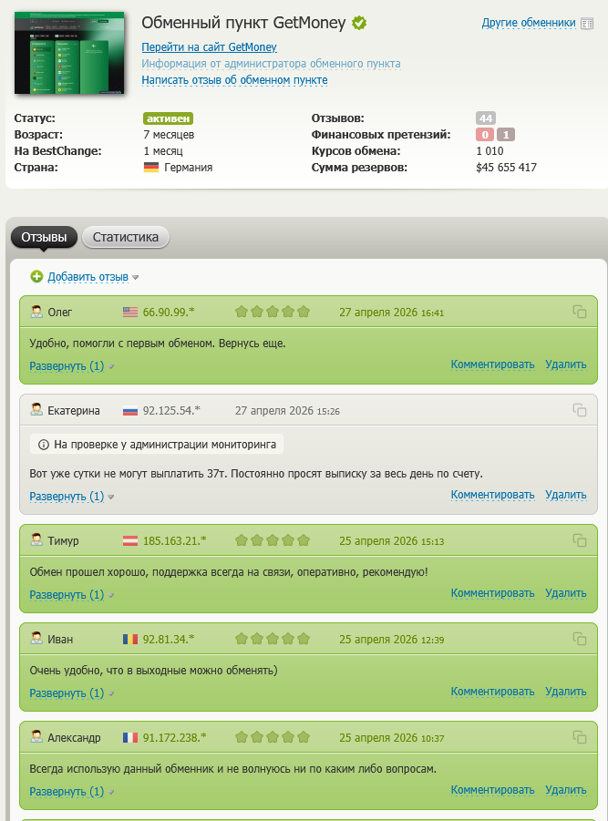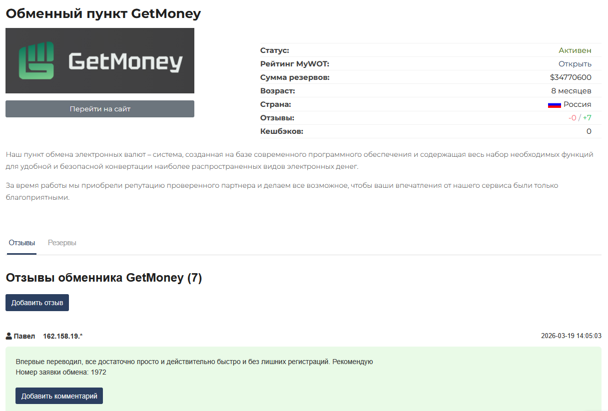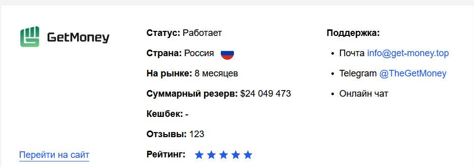В случае с «Гет Моней» так и есть: обменник есть в листинге BestChange и на многих других проверенных мониторингах. В следующем разделе обзора подробнее проанализируем рейтинг проекта на этих площадках.