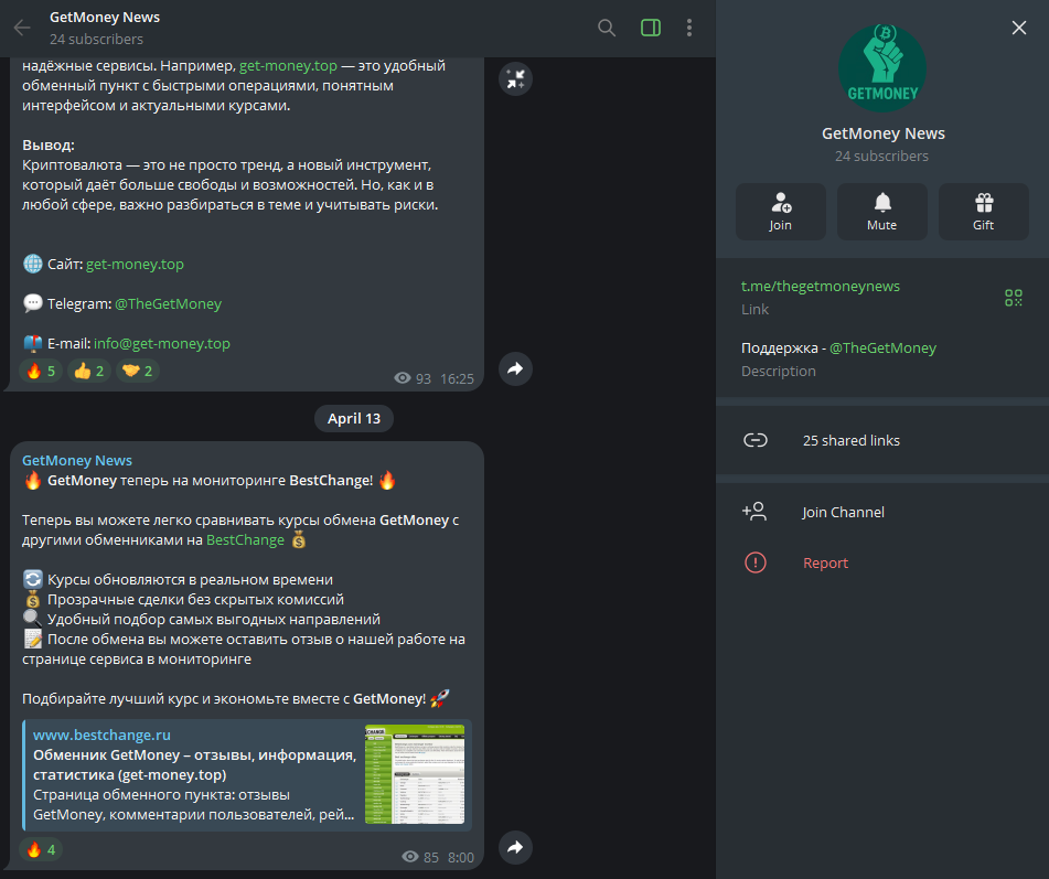 В Телеграмме у TheGetMoney есть канал и контакт поддержки. Менеджеры работают постоянно, а в ТГК всего 22 подписчика на момент обзора в апреле 2026 года. Здесь закрыты комментарии, зато доступны негативные реакции и люди их не ставят.