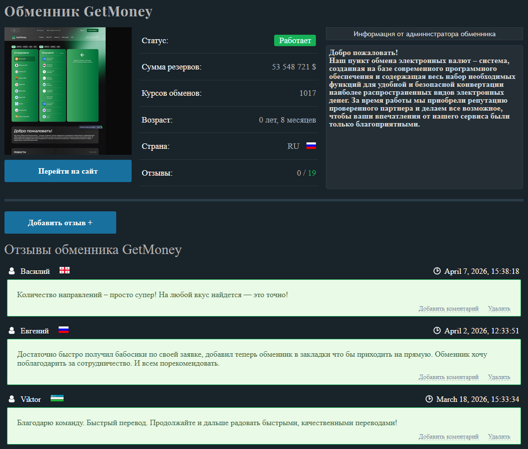 Создатели GetMoney действуют анонимно, но для криптовалютных стартапов это не критично и даже привычно. Однако надежные сервисы публикуют информацию о себе на внешних площадках, где пользователи могут изучить независимые отзывы о «Гет Мани», а сами представители пункта обмена не имеют возможности повлиять на свой рейтинг.