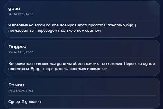 Отзывы про обменник есть в первую очередь на самом сайте. Здесь все пользователи оставляют только положительные комментарии, в которых указывают самые разные плюсы работы платформы: и выгодный курс, и исчерпывающий ответ техподдержки, и отличный сервис GhostrocketPro.