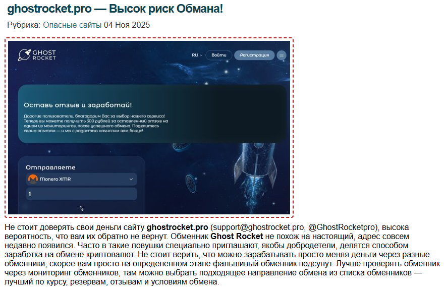 Ghost Rocket Pro — очередная ловушка для доверчивых. Обещают мгновенный обмен и выгодные курсы, но на деле — пустые слова. Отзывы на их сайте куплены за 300 рублей, а реальных подтверждений надежности нет. Не дайте себя обмануть этим мошенникам!