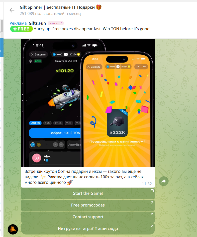 У бота 251К подписчиков — цифра не маленькая, особенно для сегмента подарочных мини-игр в тгк, где большинство проектов держится на уровне 10-50 тысяч.