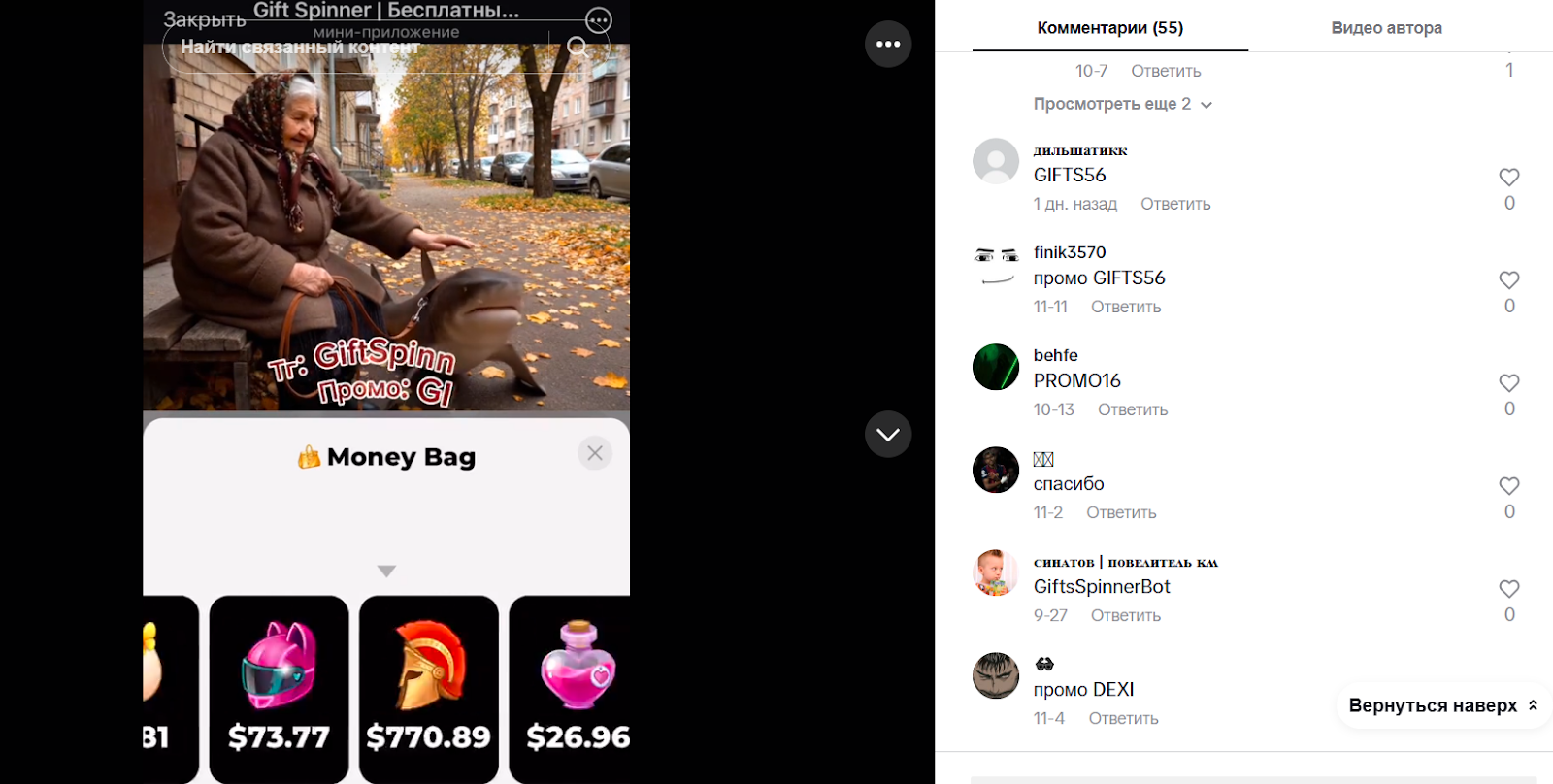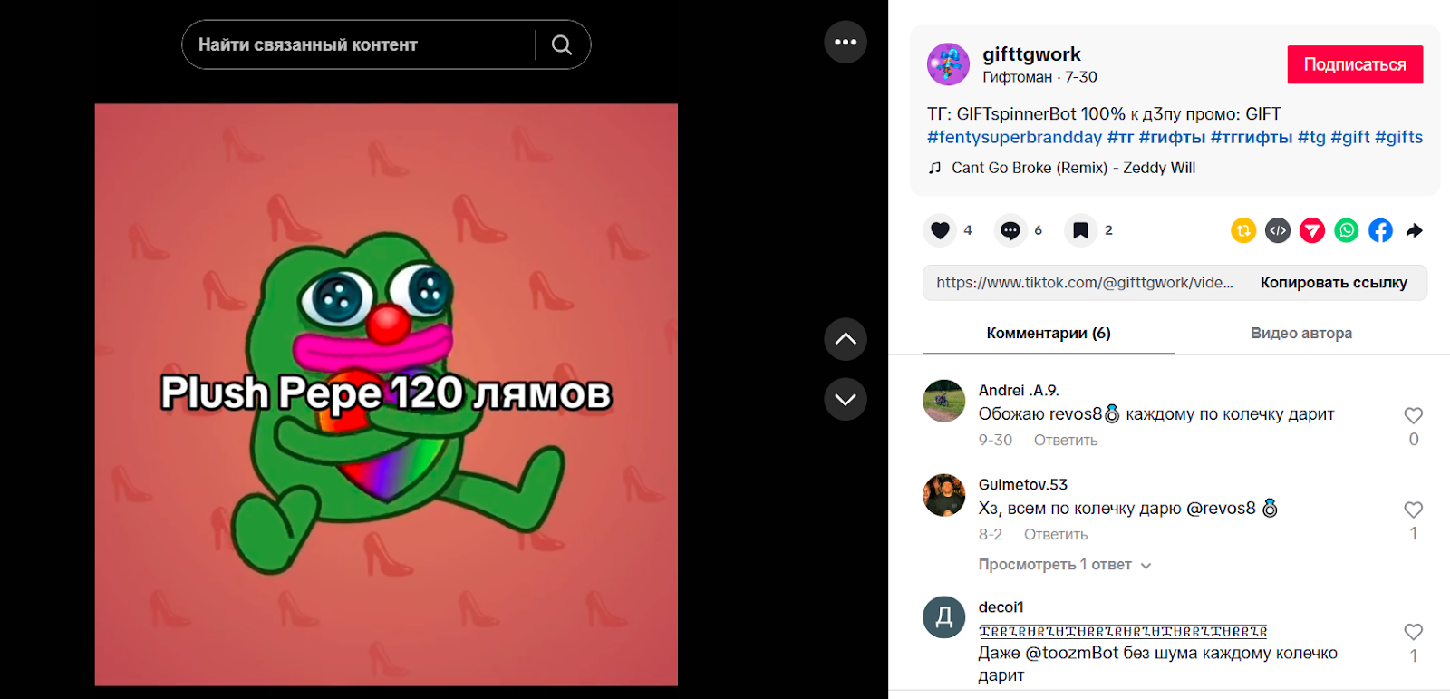 В комментариях под этими видео нет волны людей, которые говорят, что им пришел реальный приз. Зато там много аккаунтов, которые рекламируют другие боты: toozmBot, revos8, тг-гифты, как будто люди используют чужую аудиторию для своих проектов.