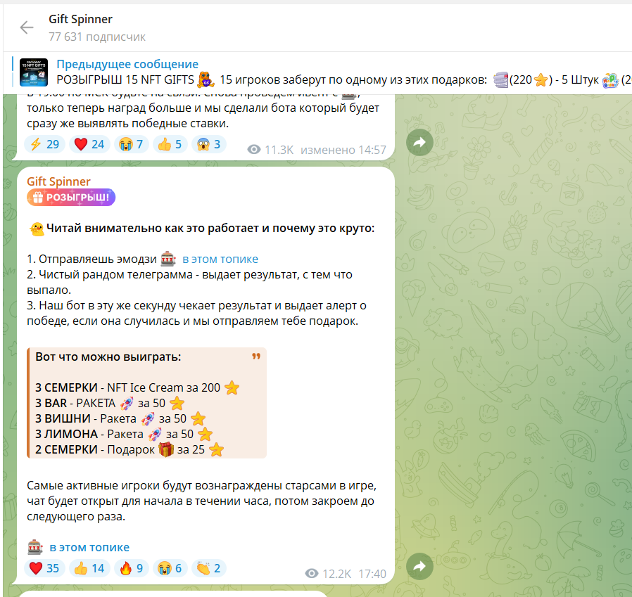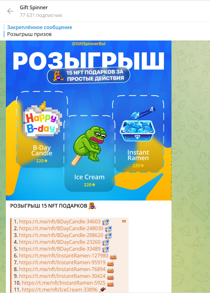Проект использует сразу два ключевых канала. Первый это основной бот @gift spinner bot с 251К подписчиков. Второй это медийный канал Gift Spinner, который связан с ботом и используется для розыгрышей и объявлений. На нем около 77К подписчиков — это подтверждено тем, что при переходе “получить бесплатно” пользователя перекидывает именно туда.