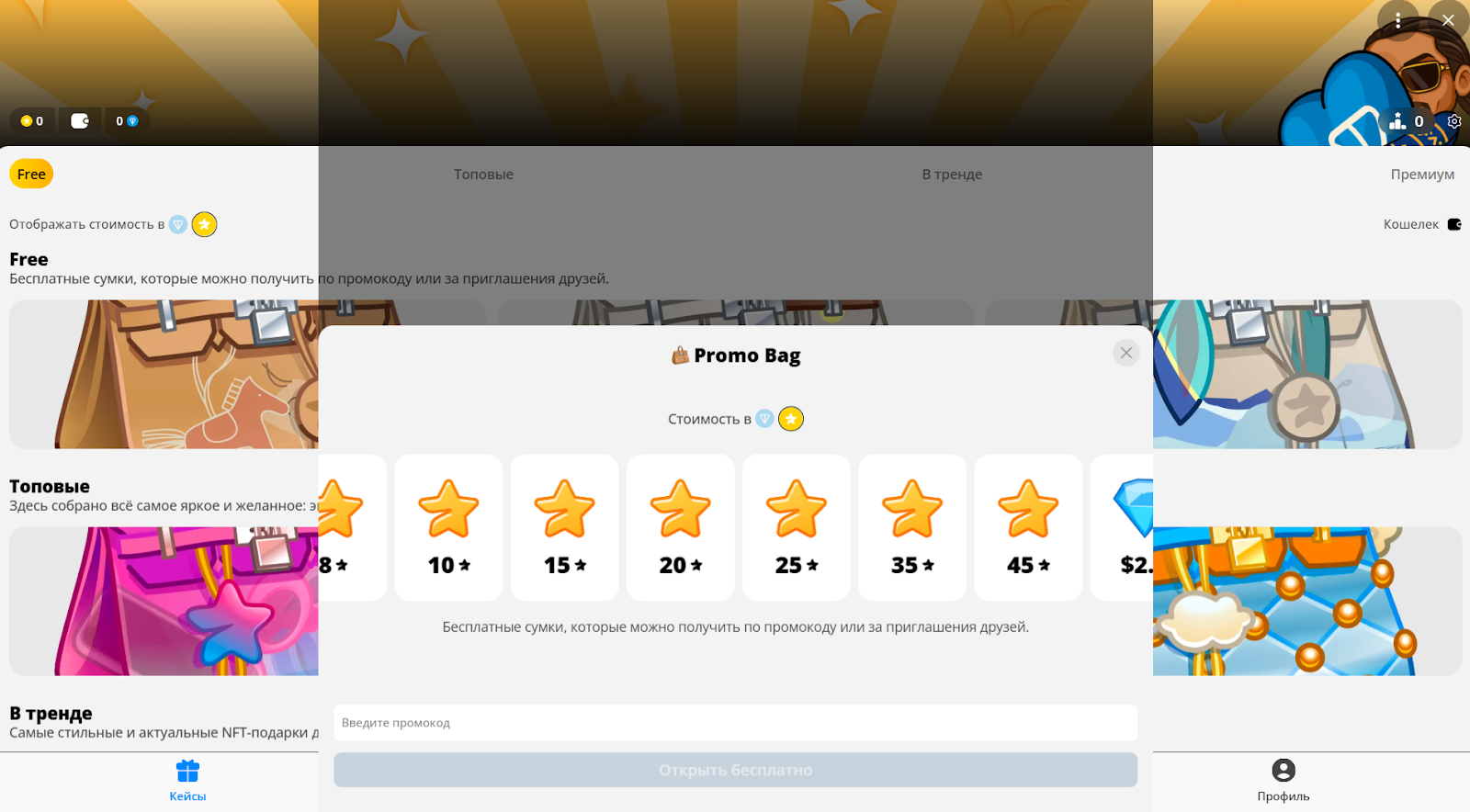 Данный бот это прежде всего экономическая модель, основанная не на реальных подарках, а на постоянной циркуляции звезд внутри самого бота. Он предлагает бесплатные кейсы, промокоды, ежедневные сумки, но параллельно подталкивает игрока к покупке звезд и открытию платных кейсов.