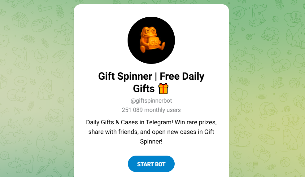 GiftSpinnerBot — это игровой бот в телеграмм, где пользователи крутят кейсы, тратят звезды, участвуют в розыгрышах и надеются получить NFT-подарки и внутриигровые призы.