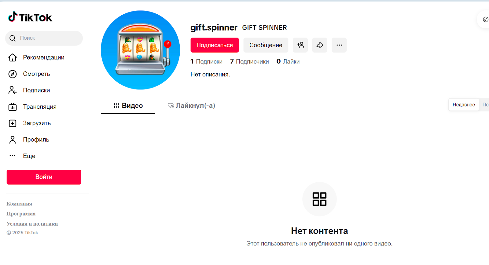 В тиктоке официальная страница бота пустая: 7 подписчиков и 0 видео. Это уже само по себе красноречиво: при таких масштабах активности внутри тг у проекта должны быть обсуждения в социальных сетях, если бы реальные подарки доставлялись массово.