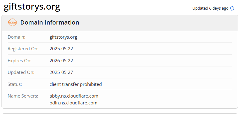 Сайт Giftstorys Org был зарегистрирован в мае 2025 года. При этом у платформы есть клоны, созданные, примерно в это же время. К таким сайтам-копиркам можно отнести shopbuya shop, redwood trus и др. Уже это может быть негативным фактором, свидетельствующим о высоких рисках сотрудничества.