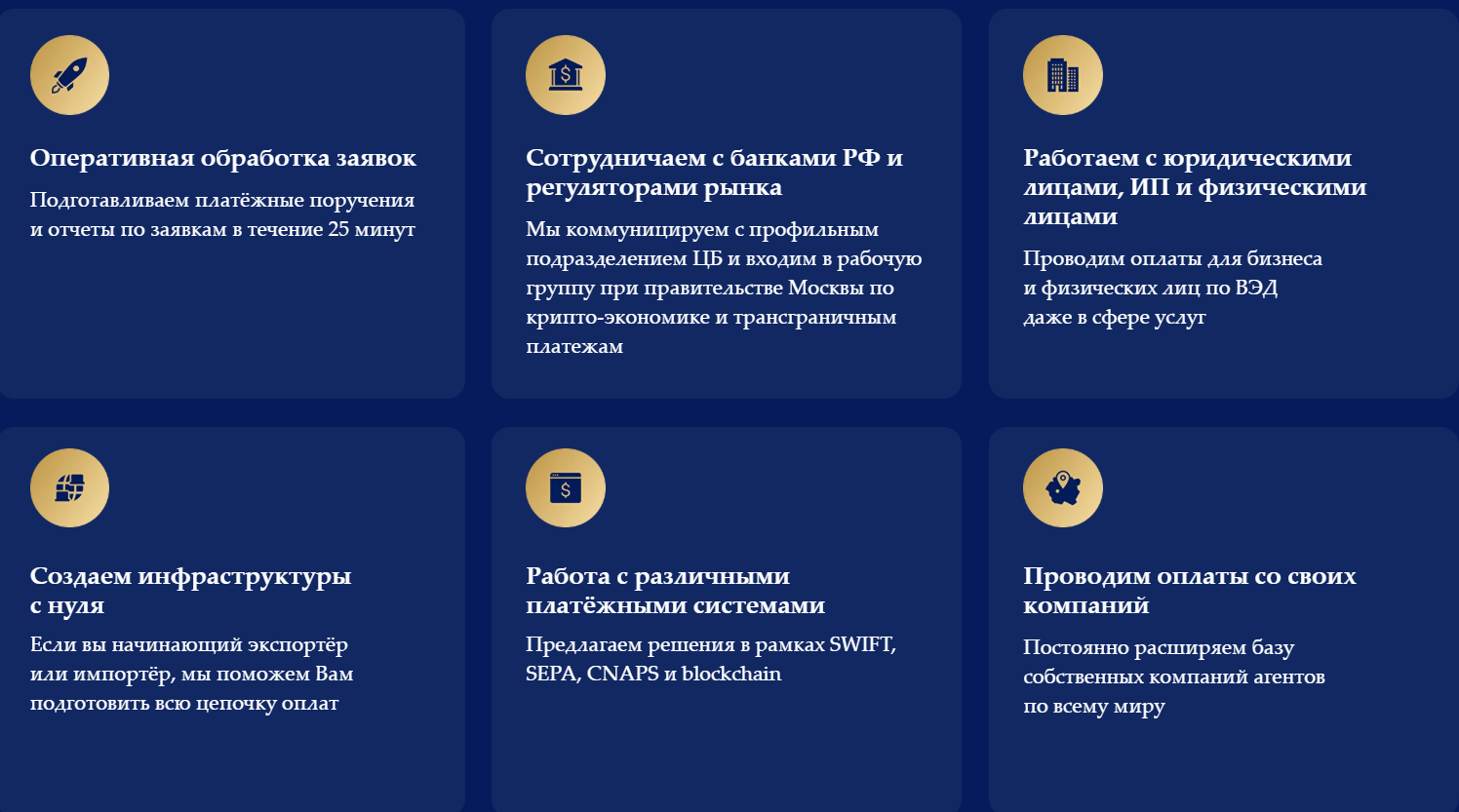 Главных направлений деятельности сервиса на ноябрь 2025 года всего шесть – от оплаты внешнеэкономических контрактов до создания компании под запросы клиентов. Подробности оказания услуг Global Finance Ved в открытом доступе не разглашает. Для уточнения порядка обслуживания, стоимости и срока выполнения запроса необходимо обратиться к техподдержке.