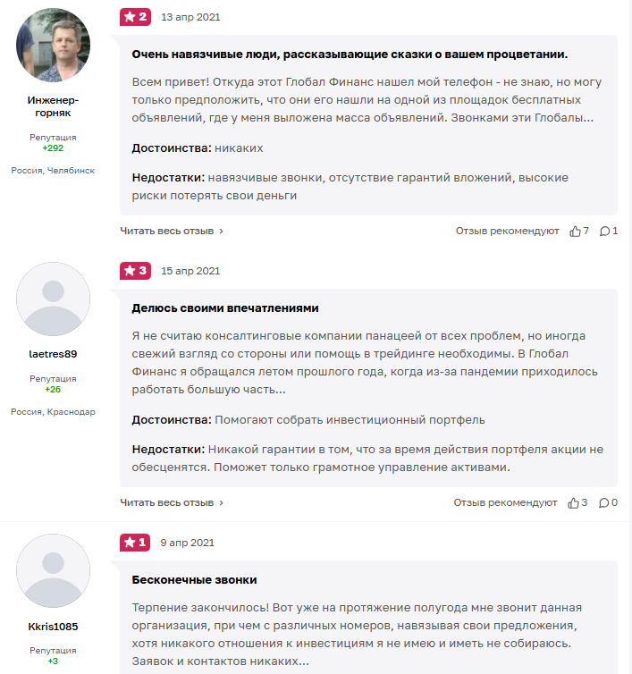 Для уточнения репутации Global Finance Ved обратились к отзывам из других открытых источников. Выяснили, что платёжная система не пользуется доверием у пользователей. Недовольные клиенты жалуются на навязчивость сотрудников, отсутствие финансовых гарантий и высокие риски потери средств.