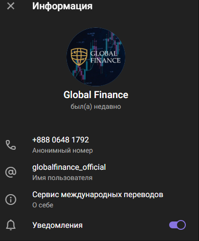 Для связи предложена электронная почта financeglobal info@gmail com или профиль Global Finance под никнеймом GlobalFinance Official в Телеграмм. Головной офис компании якобы находится в Москве-Сити. График работы службы поддержки не уточняется, примерное время ожидания ответа тоже.