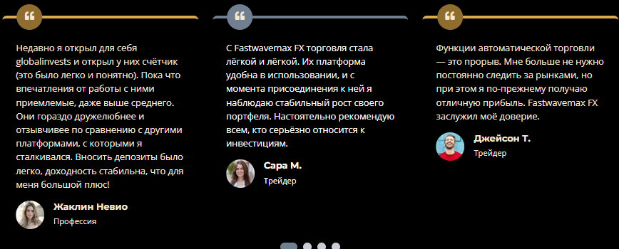 На сайте размещены отзывы якобы от клиентов. Сара М., Джейсон Т., Амина Р., Жаклин Невио хвалят платформу. Странная деталь – в комментариях упоминается Fastwavemax FX. Это другой проект. Отзывы просто скопировали. Даже названия не заменили.