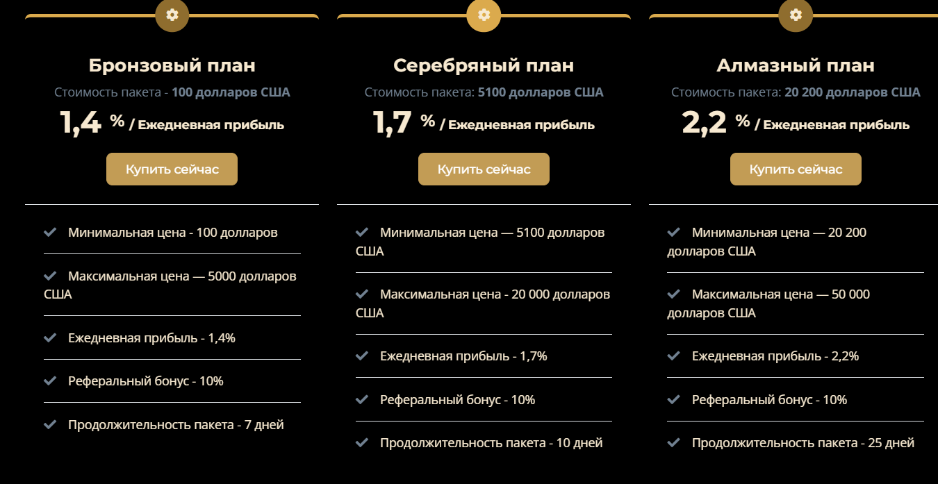 - план для ветеранов – минимум 500 тысяч долларов, прибыль 3,8% в день плюс подарочный бонус 10 тысяч долларов, срок год.