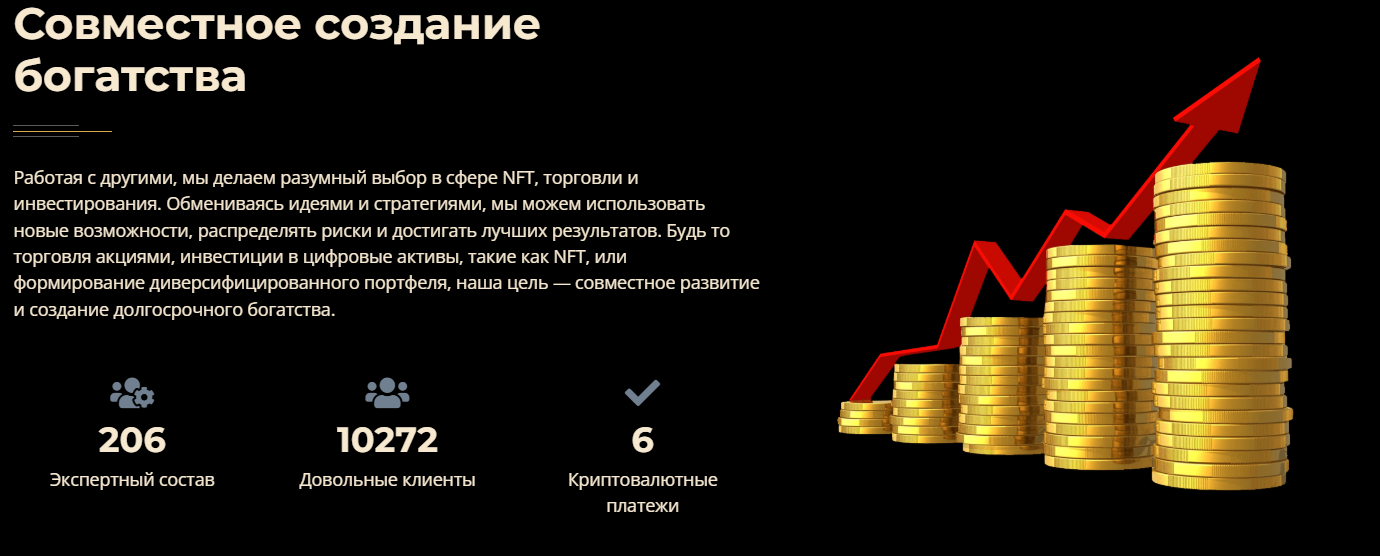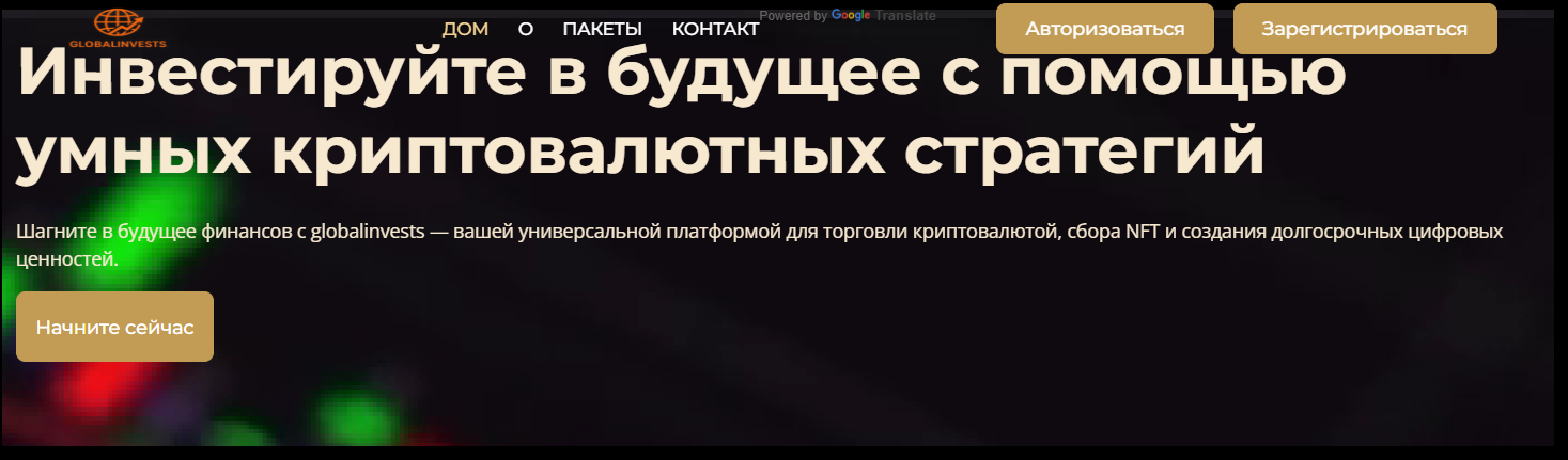 «Глобалинвестс» называет себя универсальным решением для инвестиций. На главной странице написано про умные стратегии и создание долгосрочных ценностей. Предлагается работа с криптой, NFT, валютным рынком, нефтью, газом.