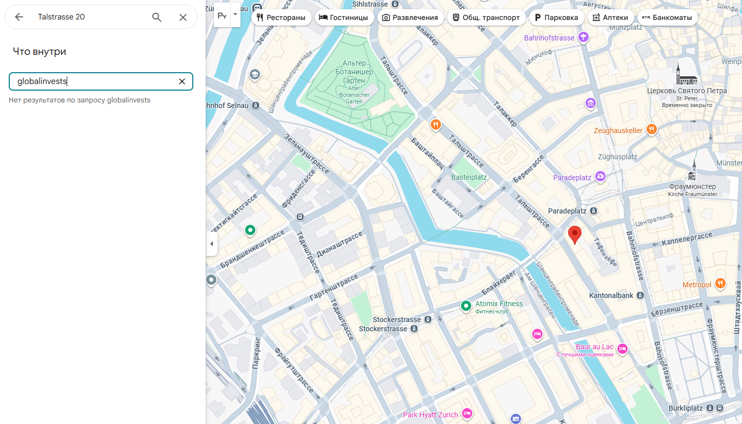 Платформа утверждает, что работает под управлением швейцарской компании globalinvests SA. Адрес указан Taltrasse 20, 8001, Цюрих. Звучит солидно. Но есть проблема.