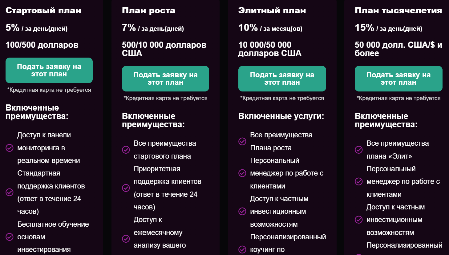- Элитный – депозит 10000-50000 долларов, ежедневные дивиденды 10%;