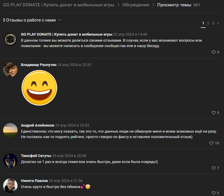 В сети и на популярных форумах нет независимых мнений о проекте, впрочем, на официальных площадках сервиса собраны преимущественно положительные комментарии. Большинство клиентов хвалят скорость, лаконичную форму заказа и вежливую поддержку. Часто пишут, что донат приходит быстрее, чем через официальные магазины, а стоимость получается ниже.