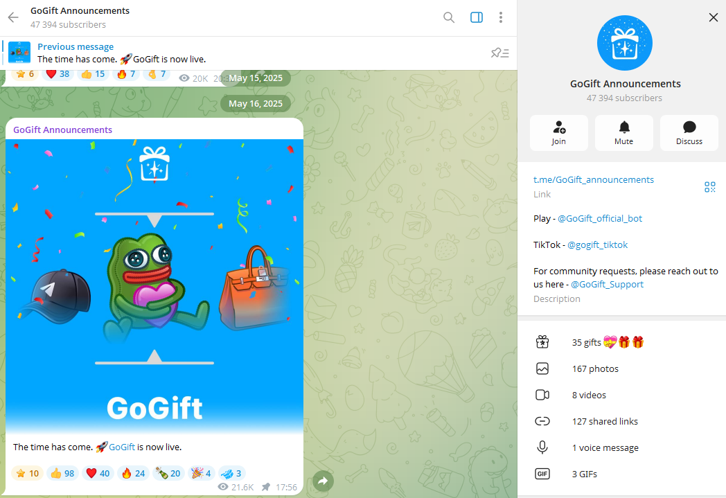 Бота запустили в мае 2025 года. Об этом свидетельствует соответствующая запись на новостном канале GoGift Announcements.