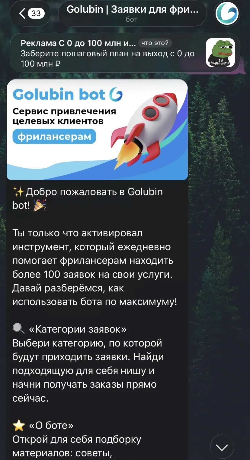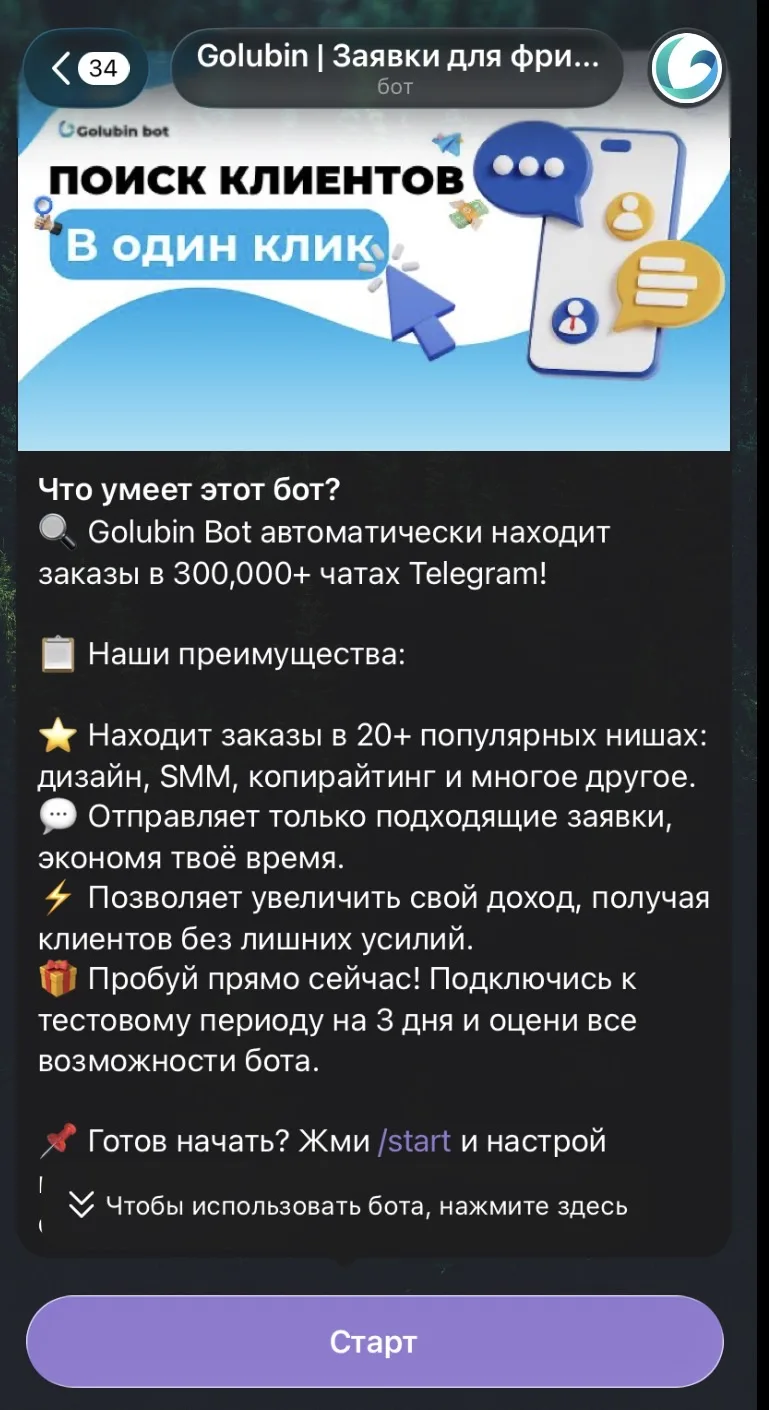 Телеграм-бот «Голубин Бот» способен автоматически находить заказы в более чем 300 000 чатах в мессенджере Telegram. Среди основных преимуществ сервиса владелец выделяет следующие: