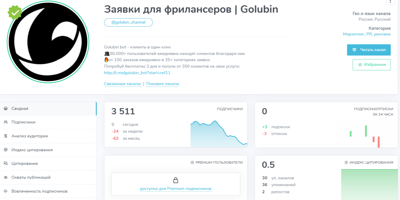 На телеграм-канал «Заявки для фрилансеров | Golubin» подписано свыше трех тысяч человек. Но число подписчиков ежедневно уменьшается. За последнюю неделю от проекта Golubin Bot отписались 24 пользователя. За месяц количество отписок составило 62. Создан канал достаточно давно – 12 марта 2022 года. Но первые сообщения были опубликованы спустя год – 28 февраля 2023 года. Возможно, предыдущие посты были удалены администратором.