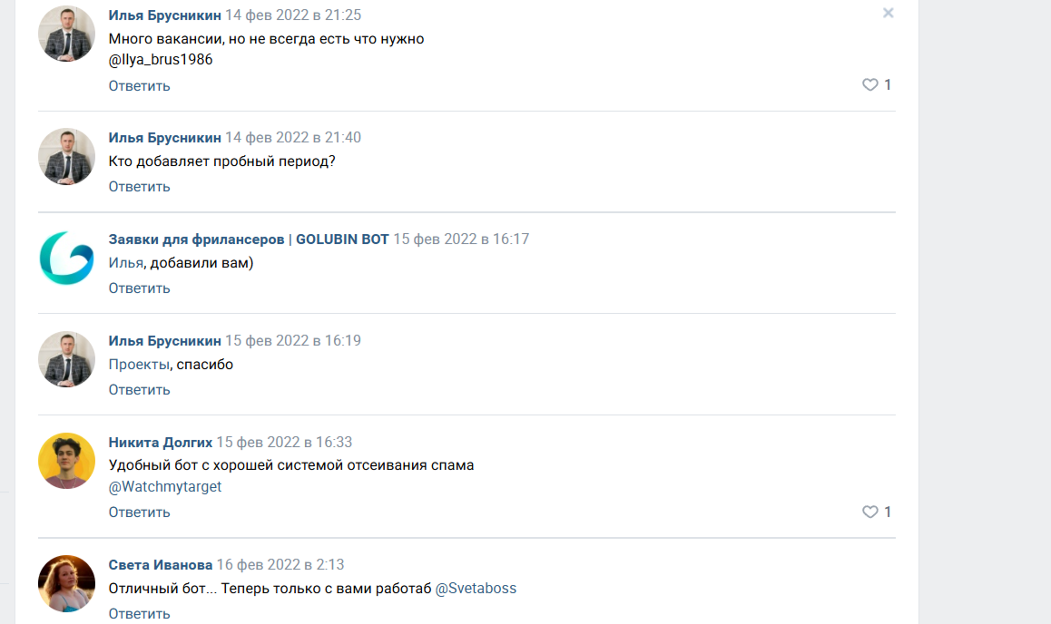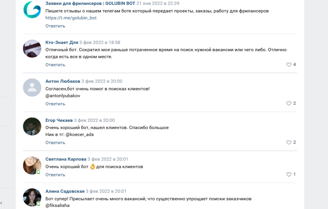 В интернете обнаружить отзывы о «Голубин Бот» не удалось. Но в сообществе Вконтакте «Заявки для фрилансеров | Golubin Bot» есть обсуждение, которое посвящено откликам клиентов. Пользователи единогласно считают телеграм-бот отличным для поиска работы. Среди преимуществ выделяют удобство использования, простой способ поиска и отсеивание спама.