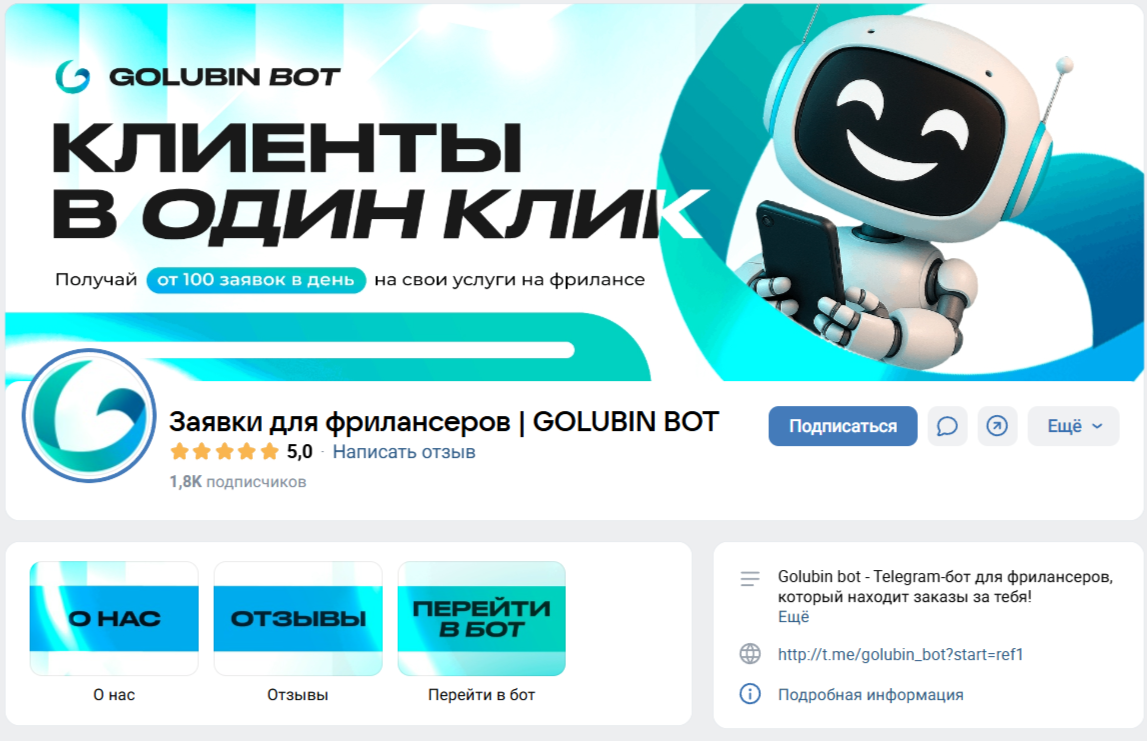 Группа «Заявки для фрилансеров | Golubin Bot» Вконтакте создана более четырех лет назад – 21 января 2022 года. На проект подписано 1 826 пользователей. Контент сообщества составляет реклама телеграм-бота «Голубин Бот», креативные ролики о работе фрилансеров и советы по поиску клиентов.
