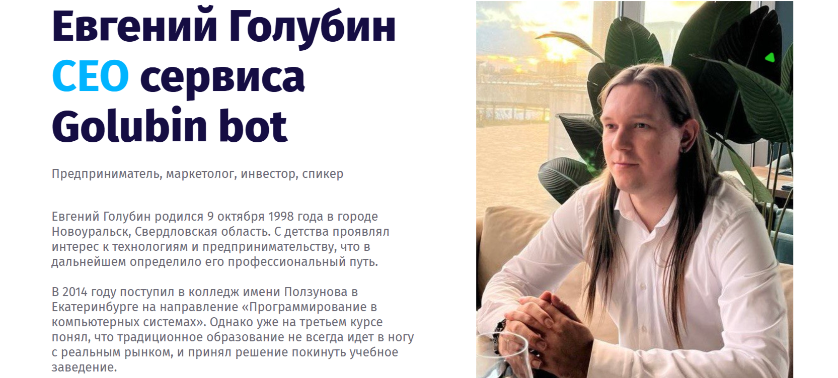 О владельце «Голубин Бот» информации в интернете достаточно много. На сайте golubinbot.ru собственнику сервиса посвящен целый раздел. Евгений Голубин родился в Свердловской области 9 октября 1998 года. В 2014 году поступил в местный колледж. Через три года обучение бросил. В 2024 году Евгений стал студентом Московского Технологического института.