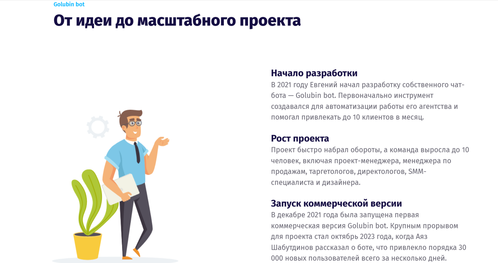 Первые шаги к разработке телеграм-бота Golubin Bot Евгений Голубин сделал в 2021 году. Изначально сервис был создан для автоматизации работы агентства. Проект начал набирать обороты. И уже в декабре 2021 года была запущена коммерческая версия площадки. После октября 2023 года проект «Голубин Бот» привлек более 30 тысяч новых пользователей. Семейное положение предпринимателя не раскрывается.