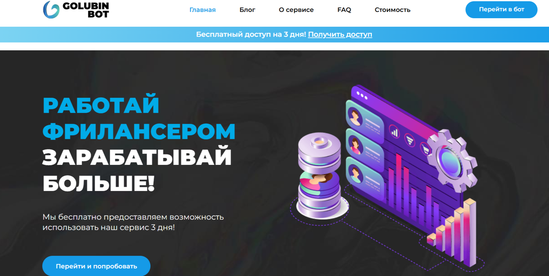 «Голубин Бот» – очень популярный среди фрилансеров сервис для поиска клиентов. Деятельность проекта не ограничена непосредственно телеграм-ботом. Владельцы площадки ведут канал в мессенджере Telegram, сообщество Вконтакте, а также собственный сайт golubinbot.ru.