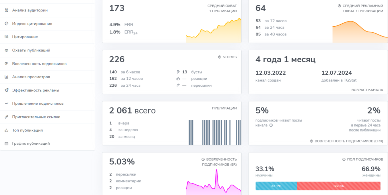 Вовлеченность подписчиков «Голубин Бот» очень низкая. Всего 5 процентов пользователей делают пересылки, оставляют реакции и комментарии. Средний охват одной публикации составляет 173. Количество просмотров реально. А вот число подписчиков, вероятнее всего, накручено телеграм-ботами.