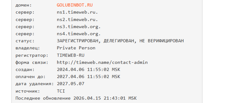 Мы проверили дату создания сайта «Голубин Бот». Создана площадка 6 апреля 2024 года. Сервис оплачен на три года. Срок регистрации заканчивается 6 апреля 2027 года.