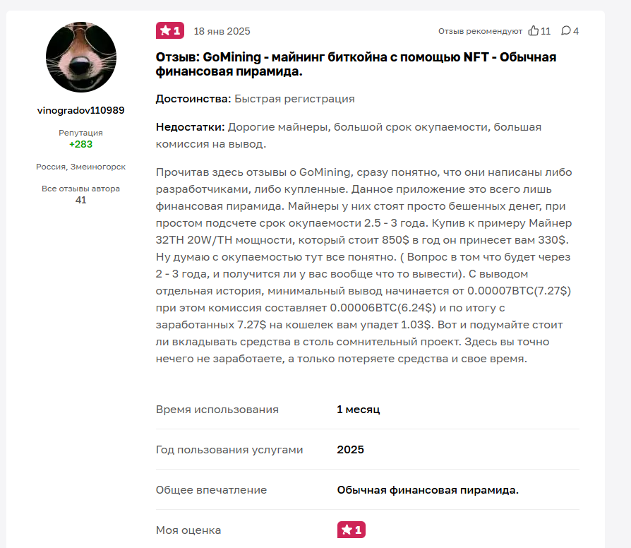 GoMining обещает золотые горы с их NFT-майнерами, но на деле это очередная ловушка для наивных. Сокращение выплат и отсутствие реальной прибыли делают этот проект пустышкой. Не ведитесь на их маркетинговые уловки – лучше держитесь подальше от таких схем.