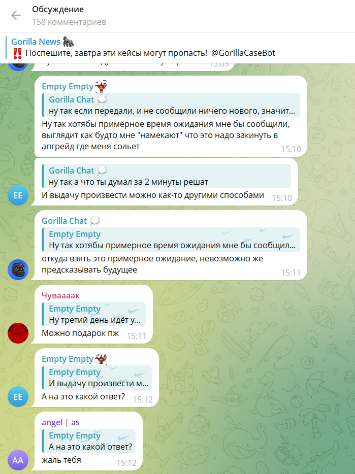 У проекта есть несколько каналов, которые создают ощущение живого комьюнити. Основной бот @Gorilla Case Bot с играми, новостной канал Gorilla News, где публикуются уведомления о кейсах и акциях, и чат с общением игроков.