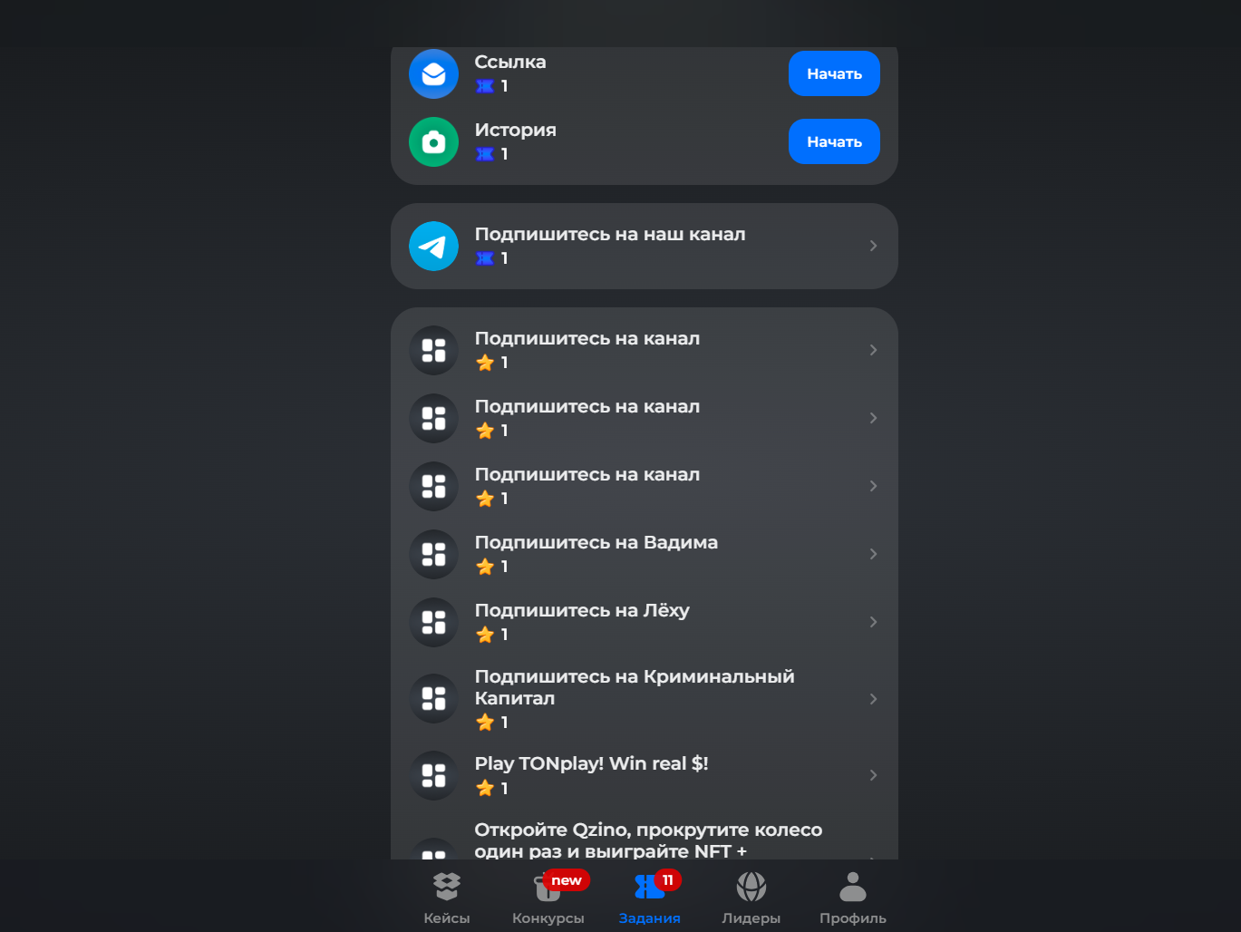Сам бот устроен просто. После старта появляется меню, где вынесены основные разделы: Кейсы, Задания, Конкурсы, Лидеры и Профиль. Вверху отображается баланс звезд и билетов.