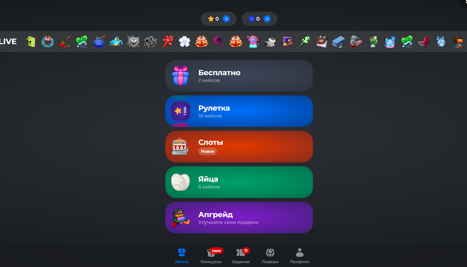 - Разнообразные игровые режимы: рулетка, яйца, слоты, апгрейд.