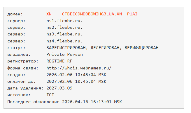 Судя по информации с Whois ru, домен зарегистрировали только в феврале 2026 года, хотя стоит отметить, что у проекта несколько похожих адресов.