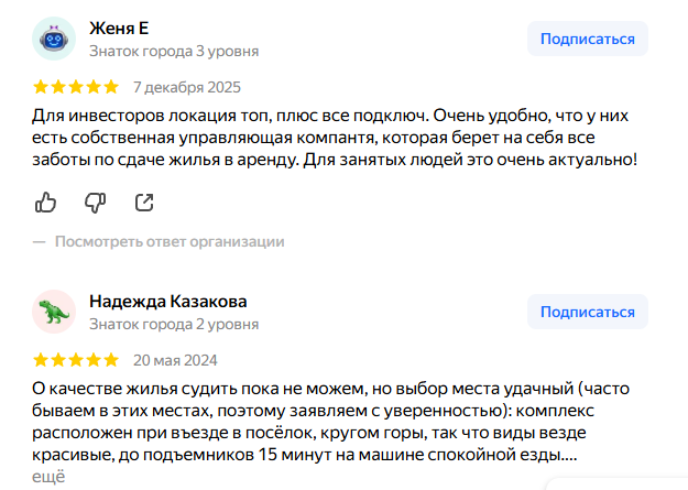 В сети отзывы о «Горы Здесь» в основном положительные, а пользователи пишут, что это хороший вариант для инвестиций, так как у организации есть управляющая компания, которая и будет заниматься арендой после окончания строительства.