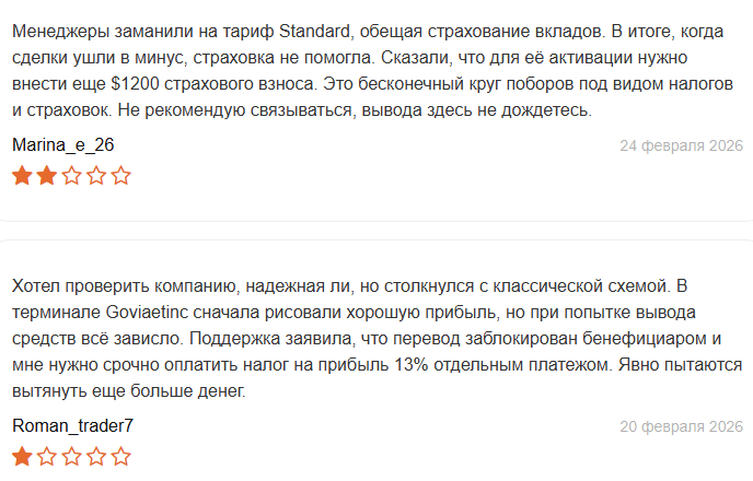На самом сайте размещены исключительно положительные отзывы о Goviaetinc с оценкой 4.6 из 5. Клиенты хвалят удобный терминал, быстрое исполнение и понятный интерфейс. Независимые отзывы в сети рисуют совершенно другую картину.