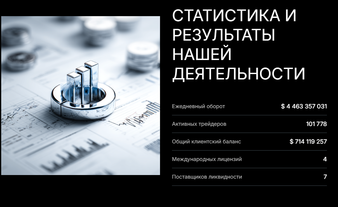 На сайте заявлены несколько направлений для торговли: валютные пары, металлы, акции и крипта. Создатели указывают ежедневный оборот более $4,400,000,000, но подтвердить эту статистику нечем, а для брокера с доменом возрастом в несколько месяцев цифры выглядят явно завышенными.