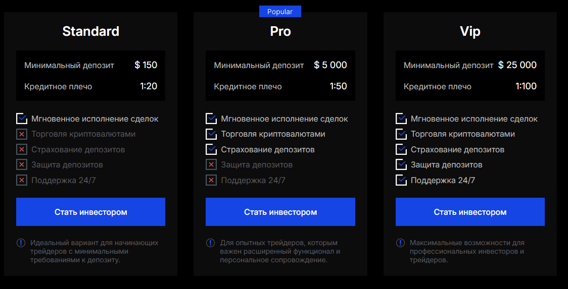 - Standard с минимальным депозитом $150 и кредитным плечом 1:20 дает базовый доступ к терминалу;