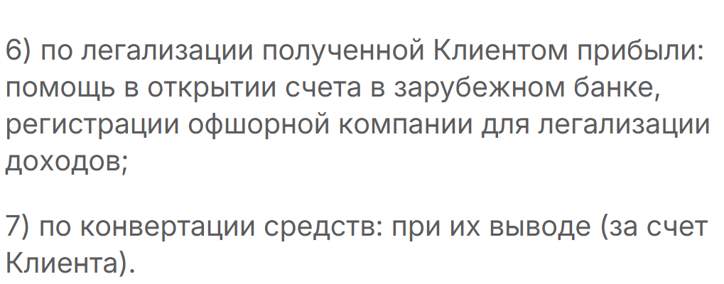 В пользовательском соглашении прописана услуга «легализации прибыли клиента», включающая помощь в открытии счета в зарубежном банке и регистрации оффшорной компании. Для легального брокера подобные пункты нехарактерны.