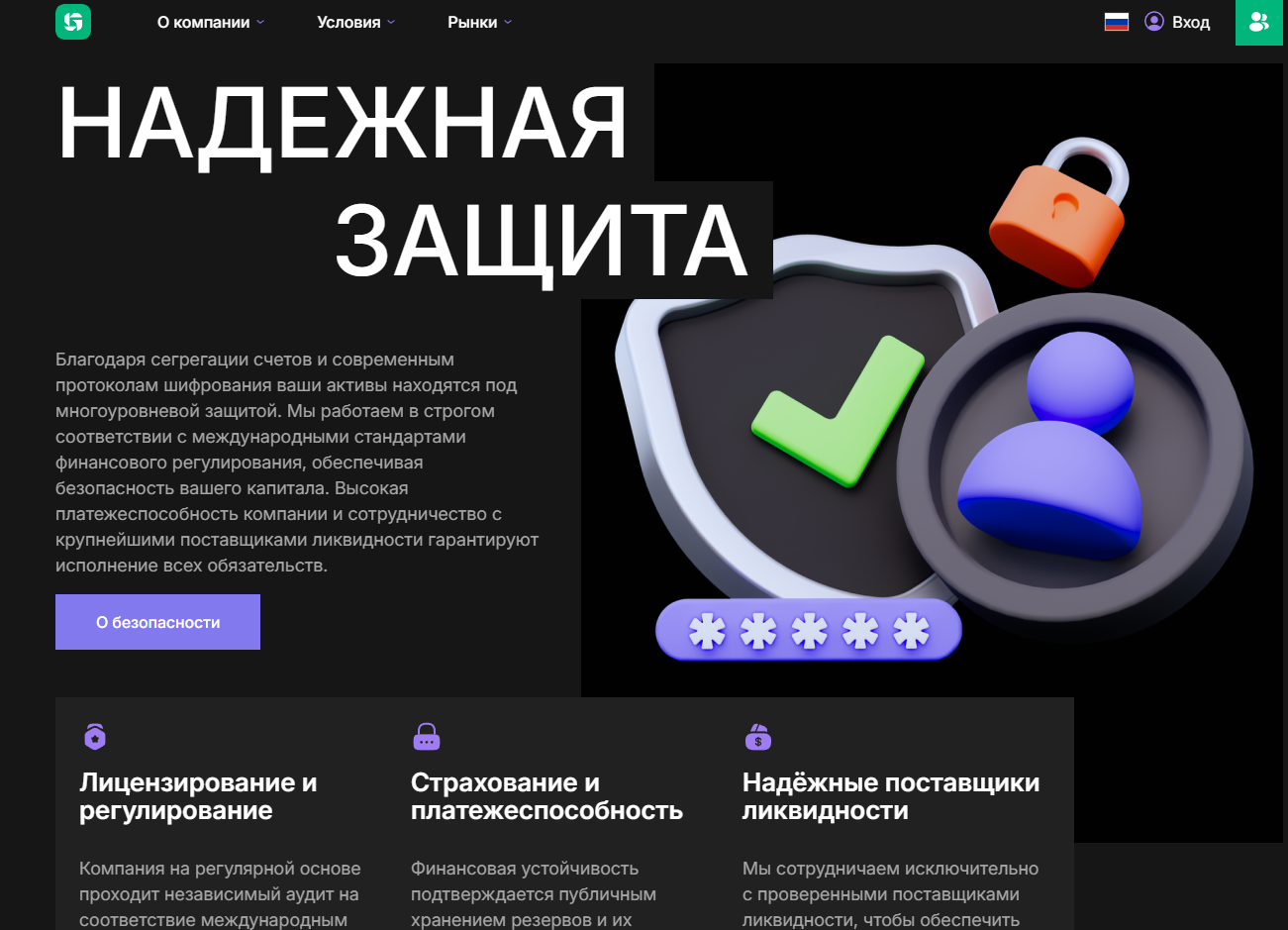 На сайте брокера говорится о высокой безопасности и защите средств клиентов. Компания утверждает, что использует современную инфраструктуру и сотрудничает с поставщиками ликвидности.