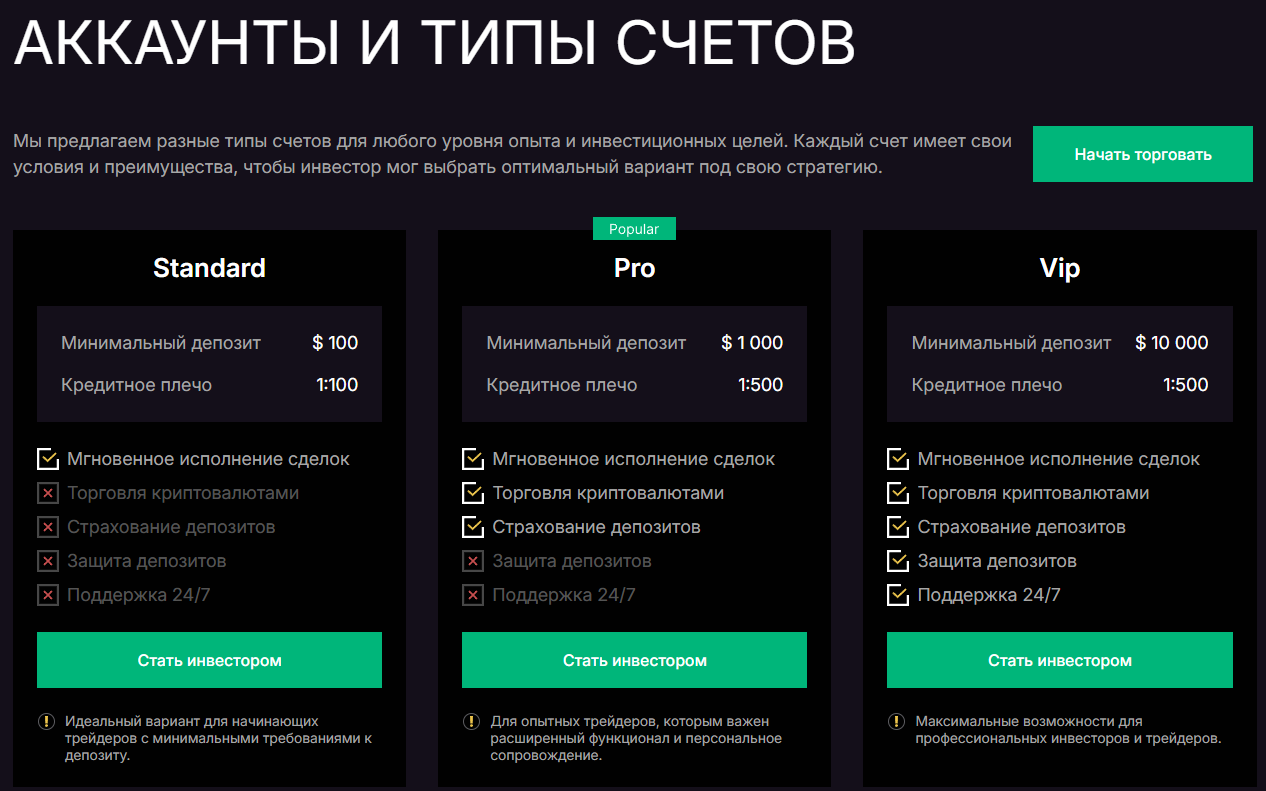 - Standard – минимальный депозит $100, кредитное плечо 1:100;