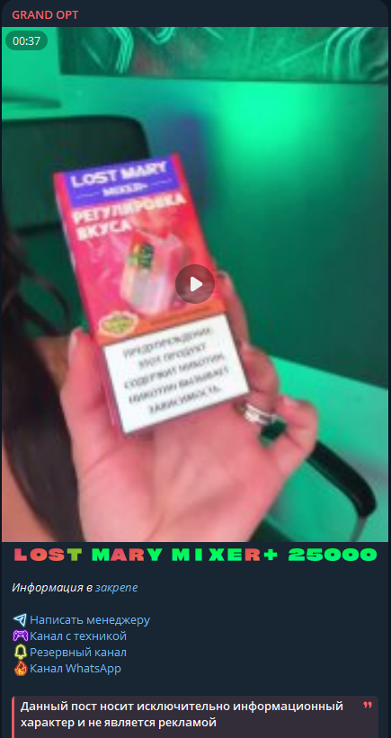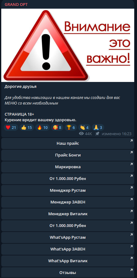 Магазин в Телеграмме Grand Opt предлагает розничные и оптовые поставки электронных сигарет через популярный мессенджер. В статье мы проверим историю развития телеграмм-канала, разберем условия сотрудничества и отзывы клиентов.