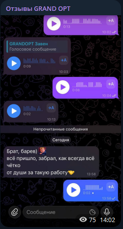 Отзывы об электронных сигаретах Grand Opt только на отдельном закрытом канале самих владельцев бизнеса. Там размещены исключительно позитивные скриншоты коротких переписок с горячими благодарностями за быструю доставку качественного товара и приятные подарки. Подобные картинки очень легко подделать или заказать у фрилансеров, поэтому слепо доверять им нельзя.