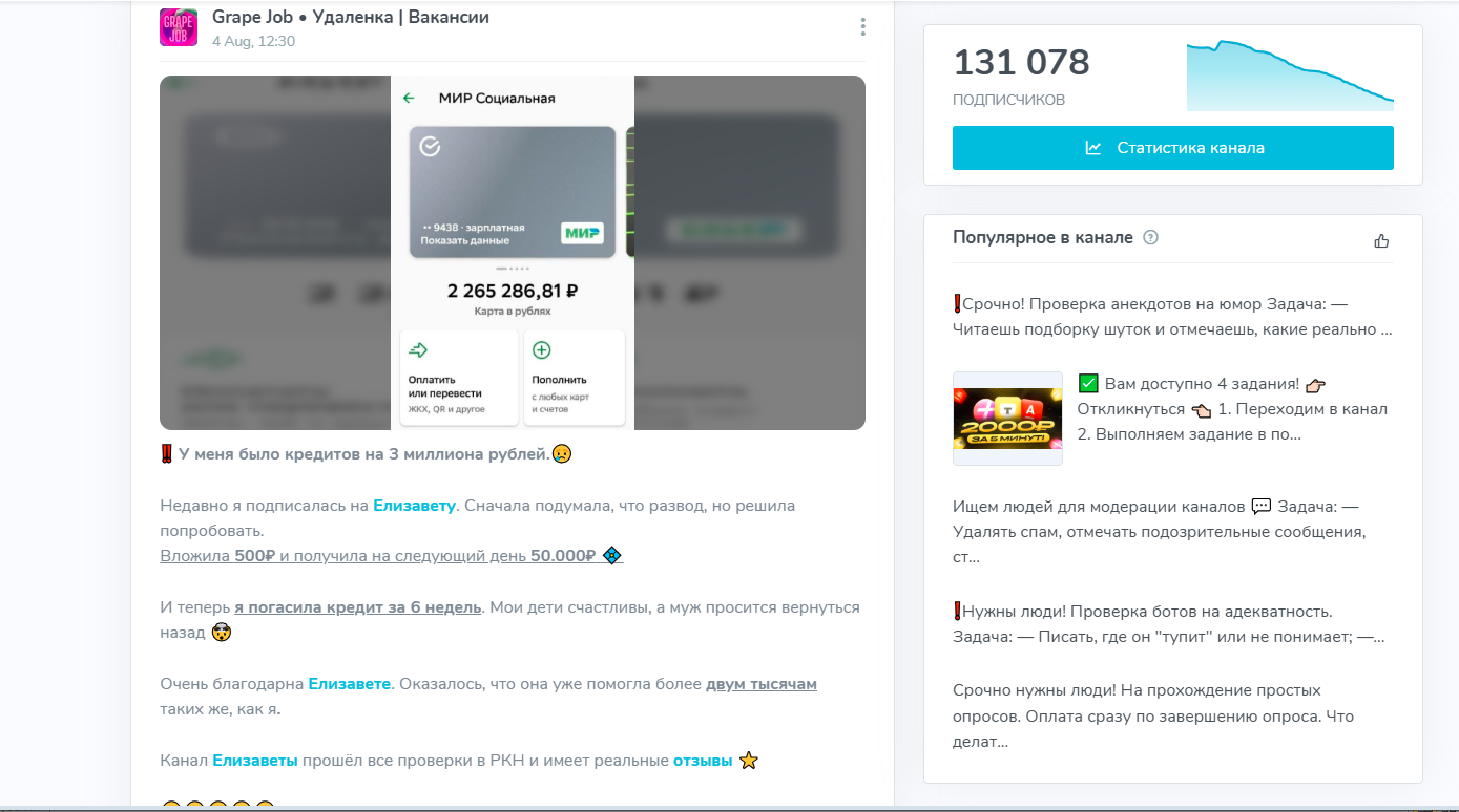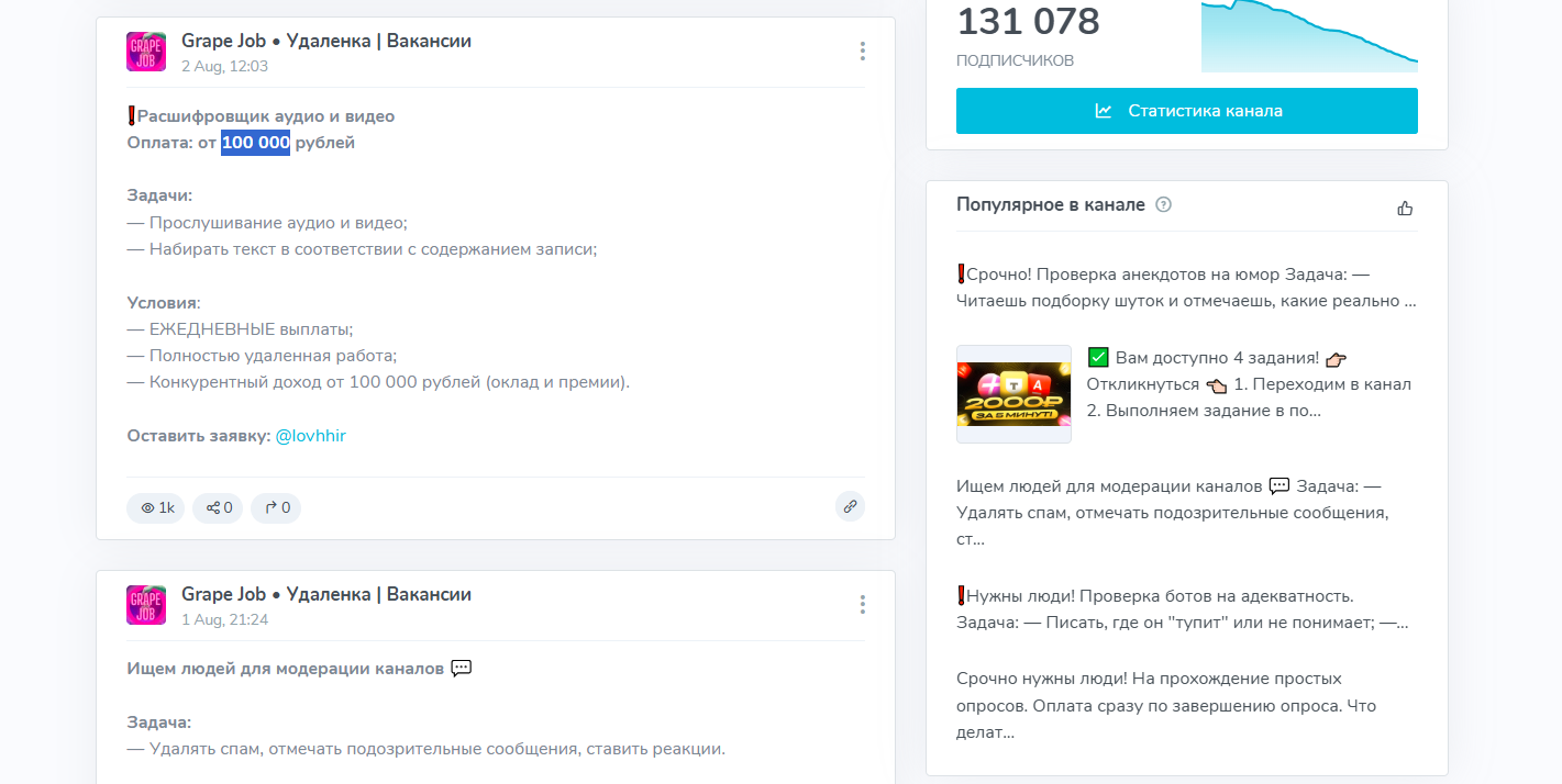 На канале Грапе Джоб 131 тысяча подписчиков, а основной контент — ежедневные вакансии, обещающие легкий заработок без особых усилий.