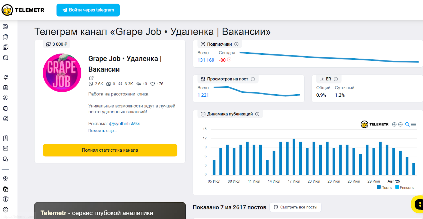 Что касается статистики, то за последний месяц канал потерял более 5,5 тысяч подписчиков. Из 131К подписчиков на посты Грейп Джоб реагирует лишь около 2%, а в первые сутки после публикации и вовсе около 1%. Охваты одной публикации держатся в районе 1,1K, что выглядит довольно скромно для такой базы.