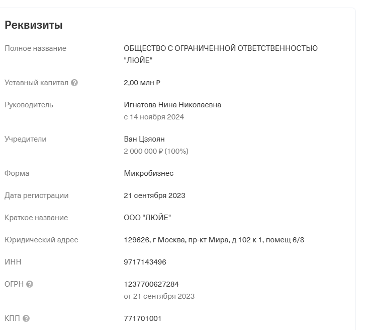 Учредителем является некий Ван Цзяоян. Компания зарегистрирована в 2023 году.